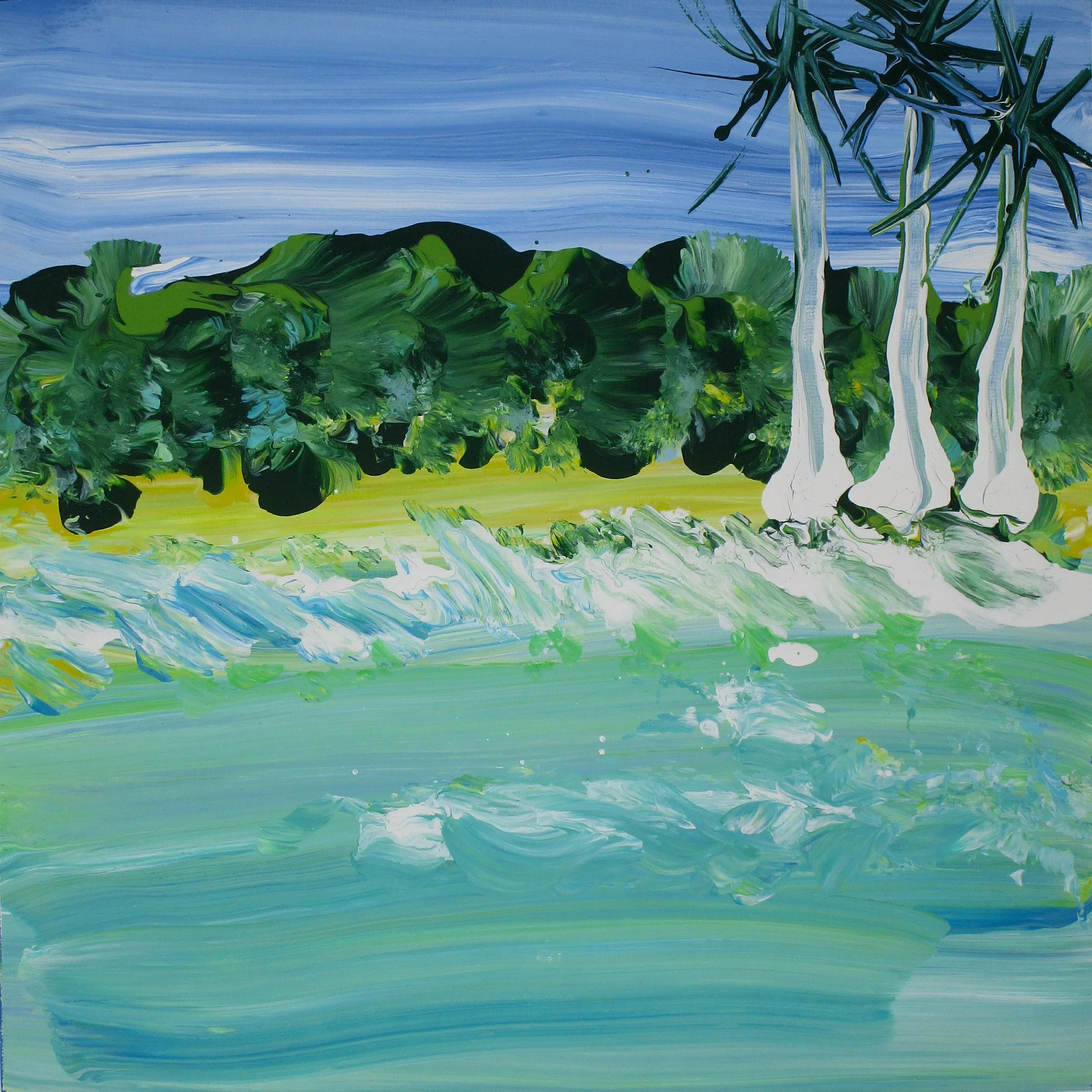 Making this painting with my mom was what originally ignited my love for painting. I remember everything about creating this: choosing the inspiration photo, matching the colors, the techniques my mom taught me to create different textures and patterns, and smushing the paint brush against the paper to create the bushes. But the part that stuck with me the most was the way she unintentionally taught me that art has no rules. We turned the paint brushes upside down and used the rounded off tips of the handles to make the trunks of the palm trees. Then we did the same thing with a thinner brush to make the fronds. I was approximately 10 years old at the time.
